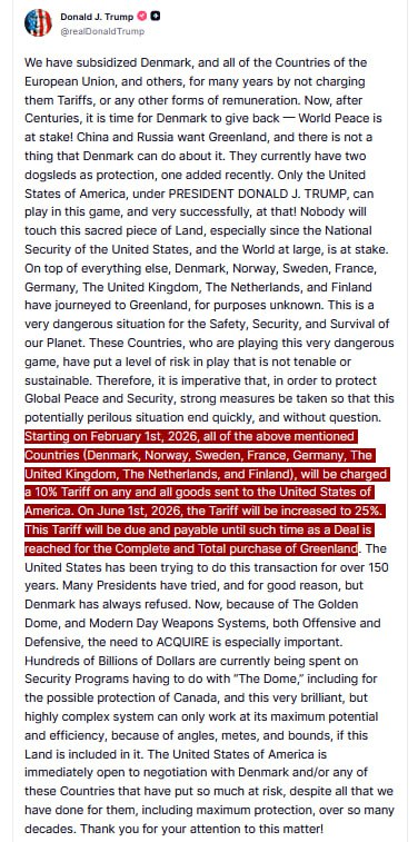 JUST IN - Trump announces 10% tariffs for Denmark, Norway, Sweden, France, Germany, UK, Netherlands and Finland from Feb 1st, 👉 increasing to 25% on June 1st, until "a Deal is reached for the Complete and Total purchase of Greenland."