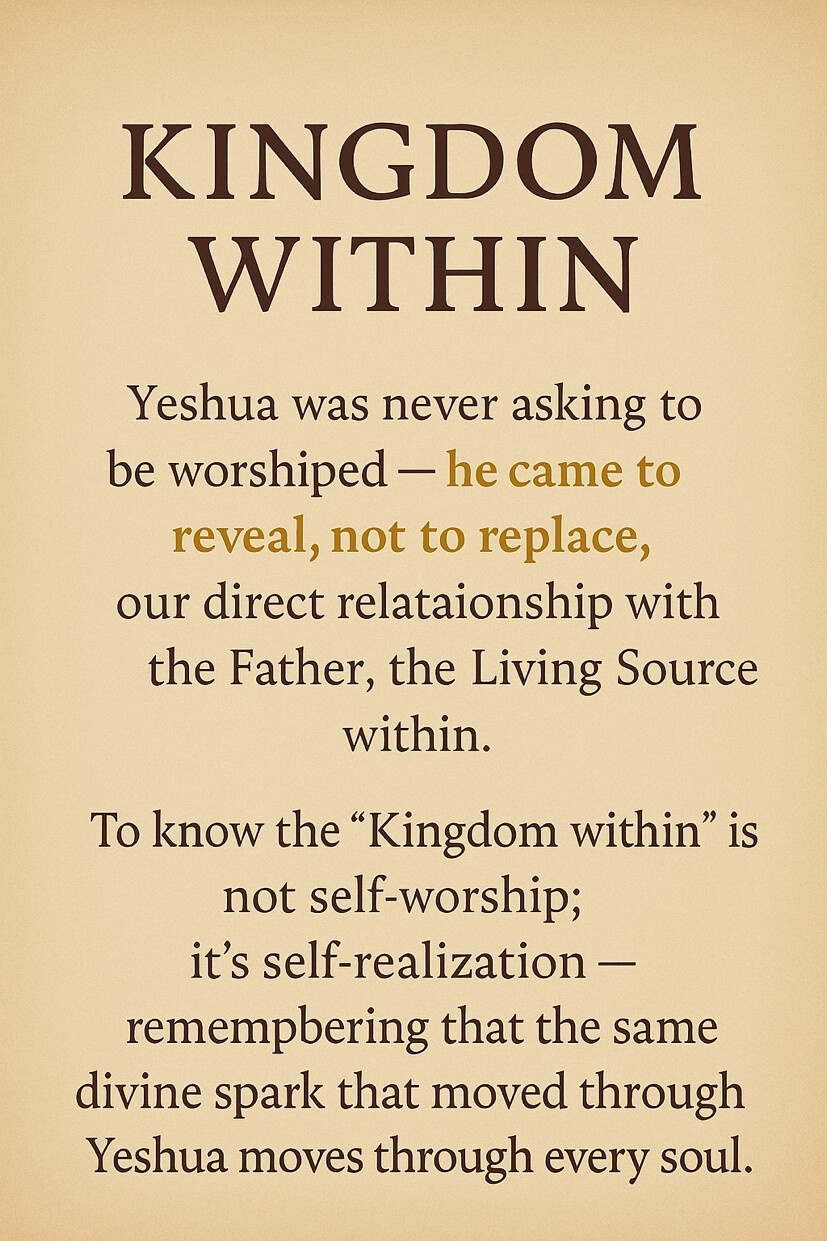 To know the “Kingdom within” is not self-worship; it’s self-realization, remembering that the same divine spark that moved through Yeshua moves through every soul. When we live from that inner light, we honor God more fully than any ritual of fear or separation ever could. 🌟