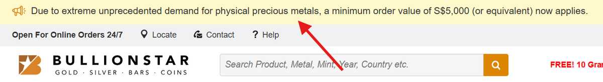 "Due to extreme unprecedented demand for physical precious metals, a minimum order value of S$5,000 (or equivalent) now applies." - Yep, now they are using the word "extreme."