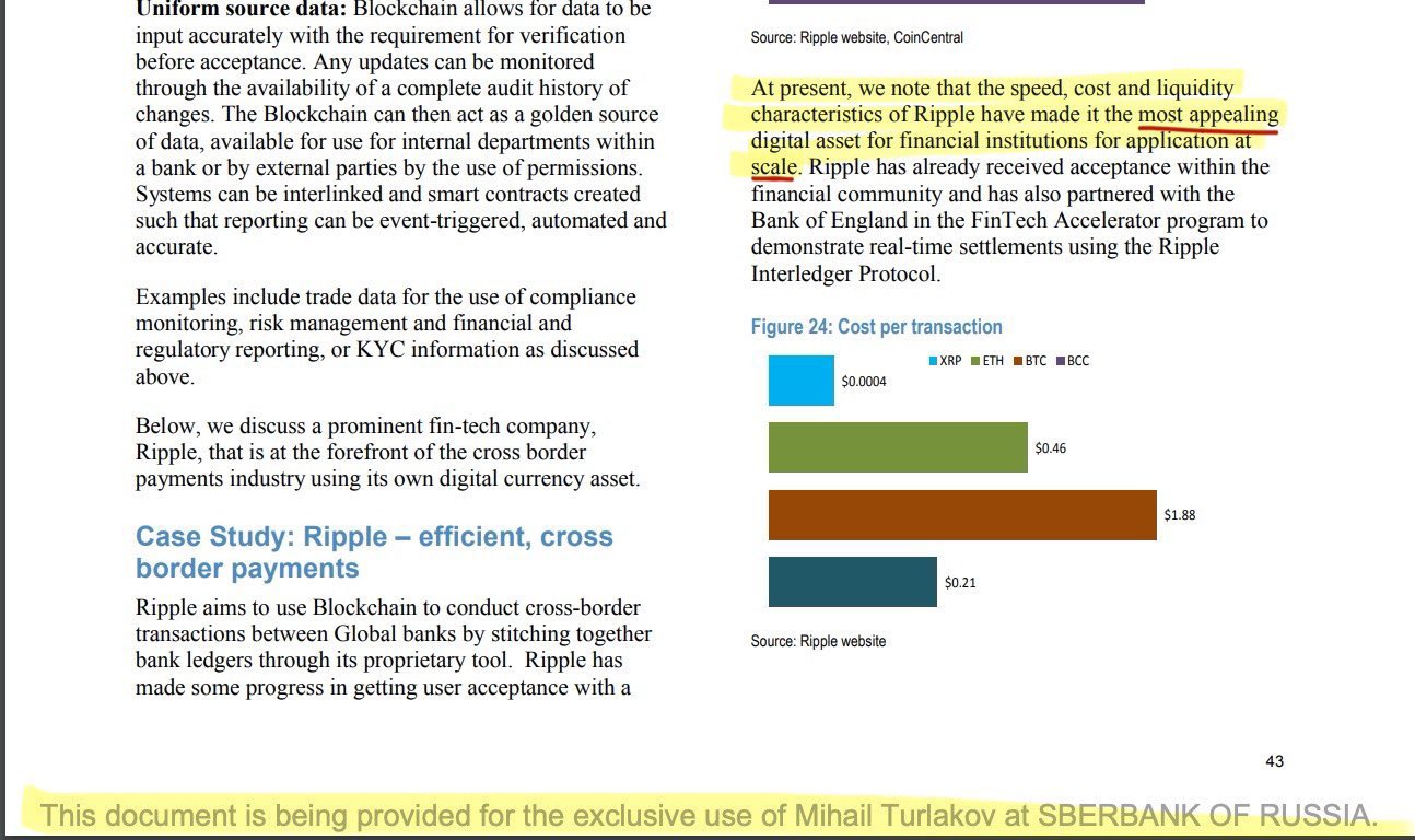 • Ripple is highlighted in a JP Morgan report (provided exclusively to Mihail Turlakov at Sberbank of Russia) for its speed, cost and liquidity advantages, making it the most appealing digital asset for financial institutions at scale with potential to disrupt global cross-border payments.✅