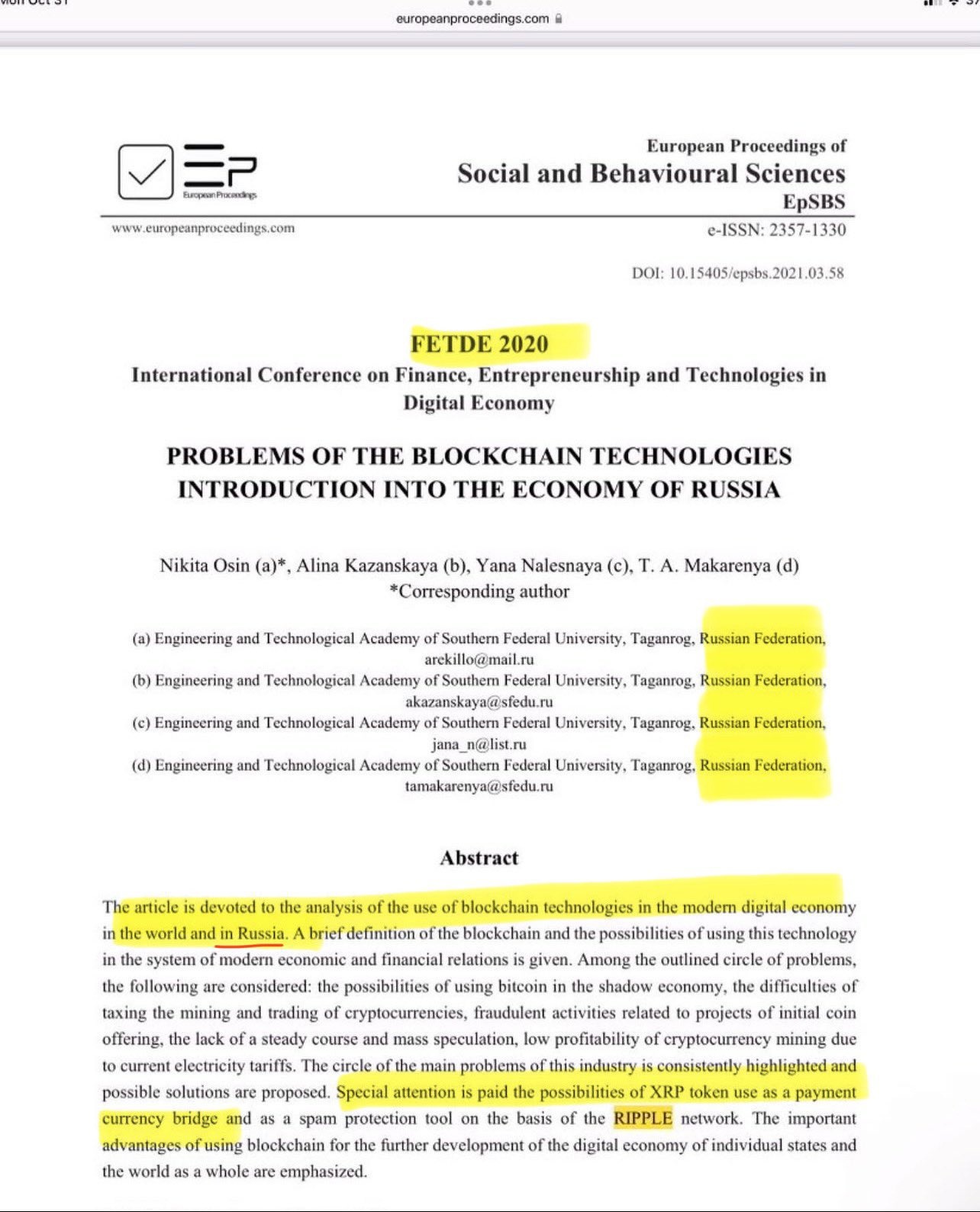• A 2020 academic paper from Southern Federal University (presented at FETDE 2020 conference) analyzes blockchain adoption in Russia and gives special attention to XRP’s possibilities as a payment currency bridge and spam protection tool on the Ripple network.✅