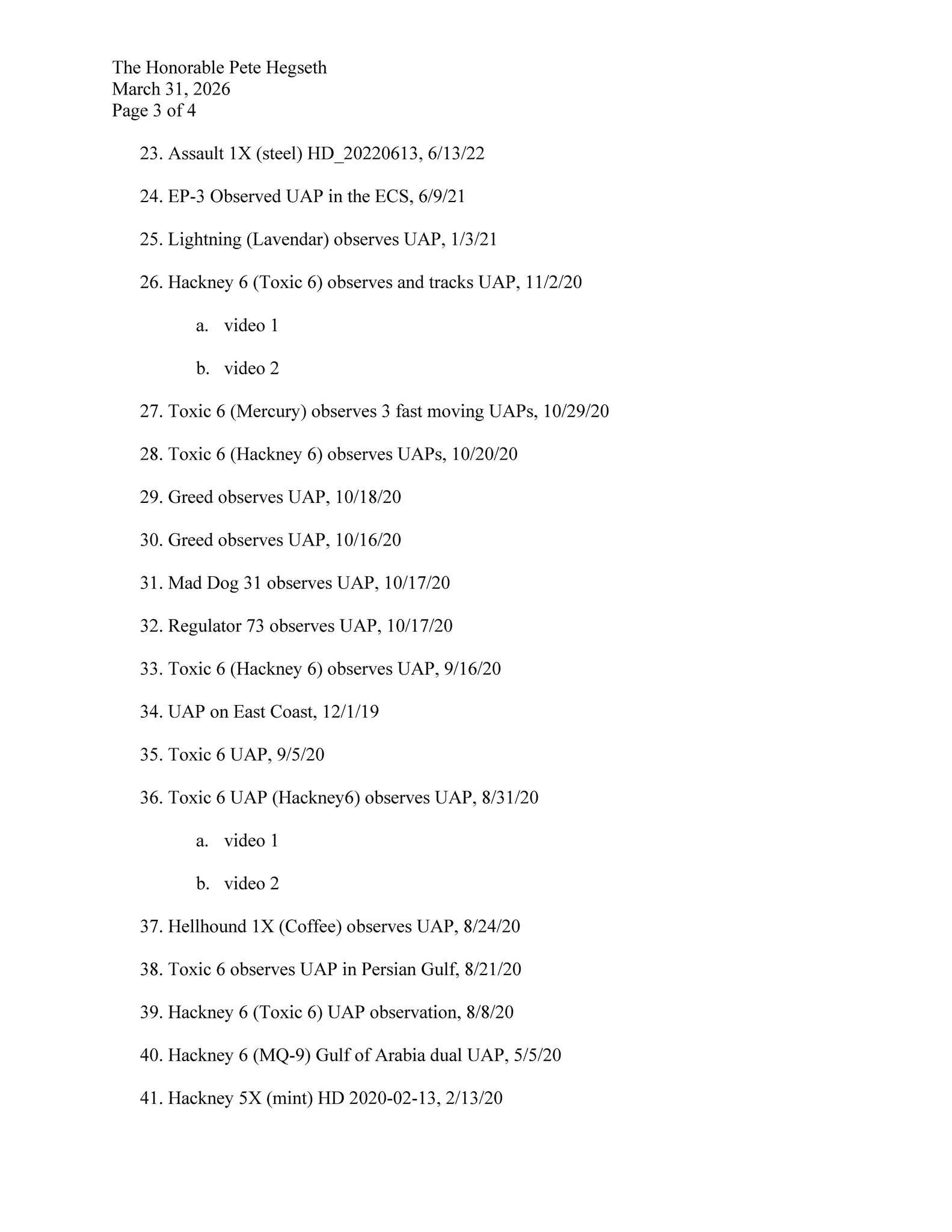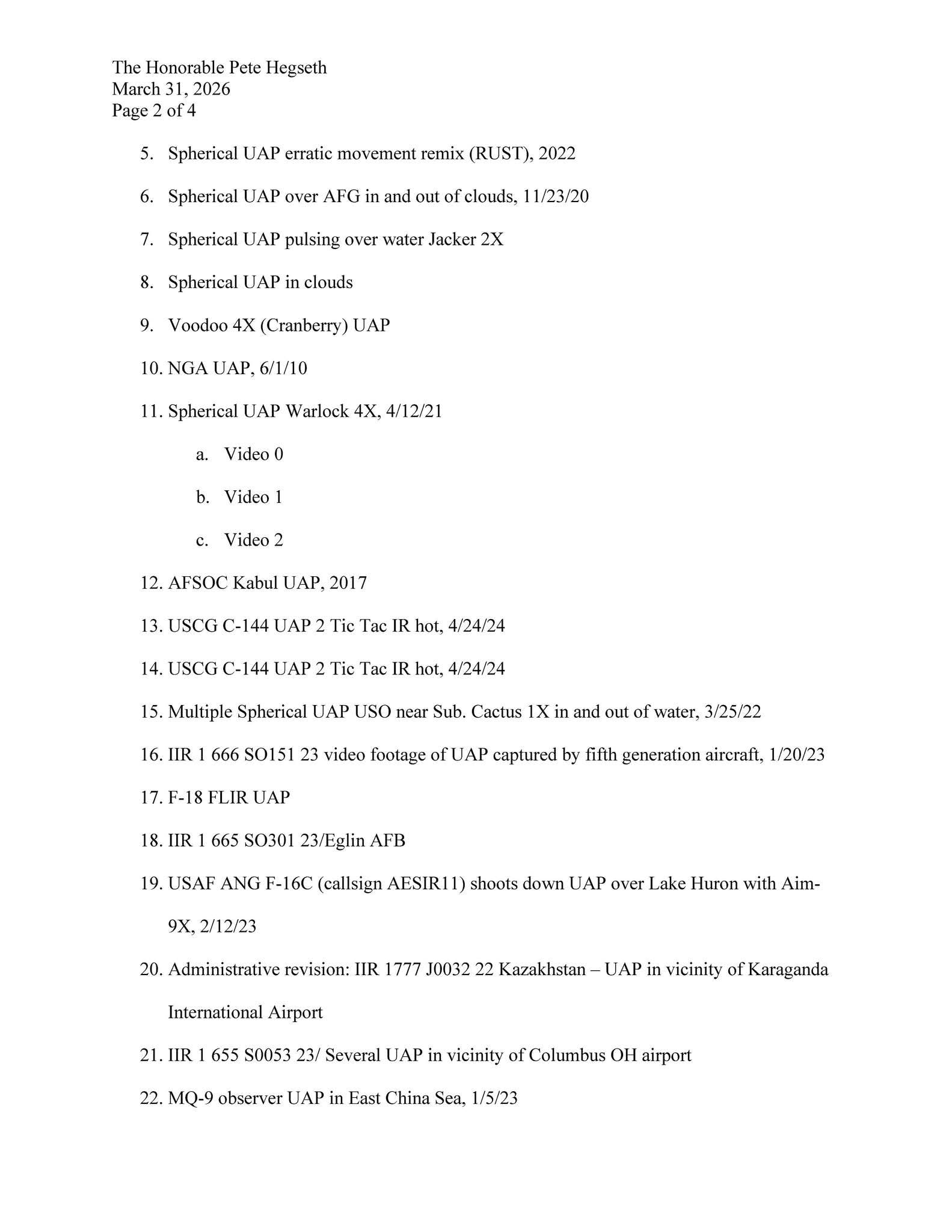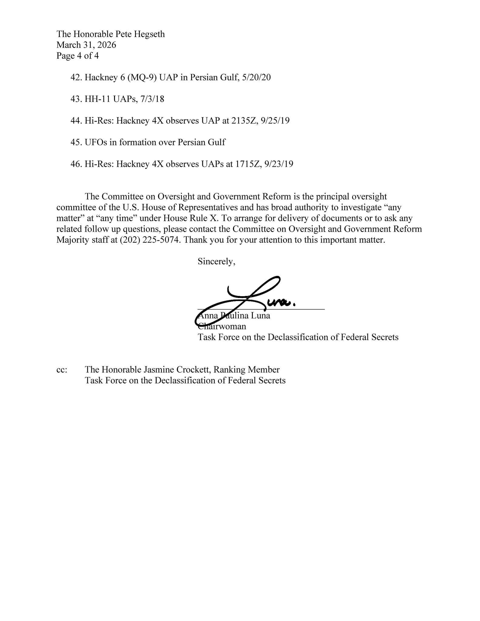 Congresswoman Anna Paulina Luna sent this letter to Defense Secretary Pete Hegseth requesting a series of video files related to UAP sightings.