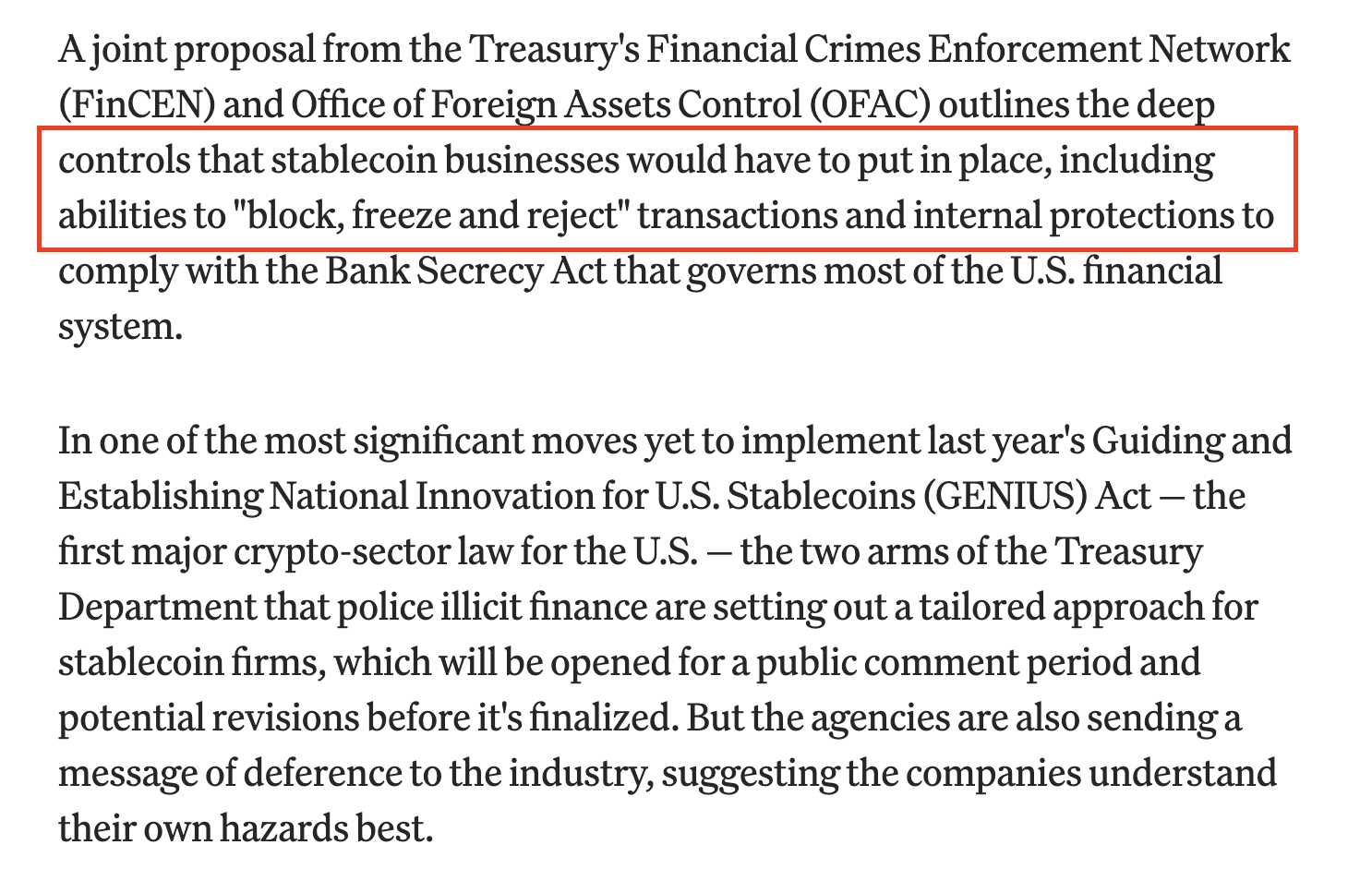 The U.S. Treasury is set to propose joint rulemaking by FinCEN and OFAC imposing AML and sanctions compliance requirements on stablecoin issuers, requiring them to implement risk control frameworks with the ability to identify, block, and freeze suspicious transactions, apply risk-based customer and activity monitoring, and support law enforcement investigations by tracing relevant transactions.