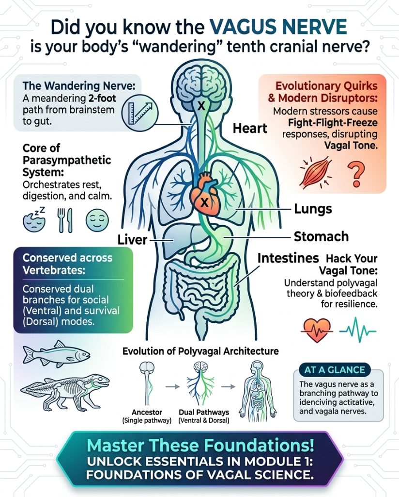 Evolutionary biology explains its dual-branch architecture through Polyvagal Theory. The newer ventral branch facilitates social safety, while the ancient dorsal branch manages immobilization under extreme threat.
