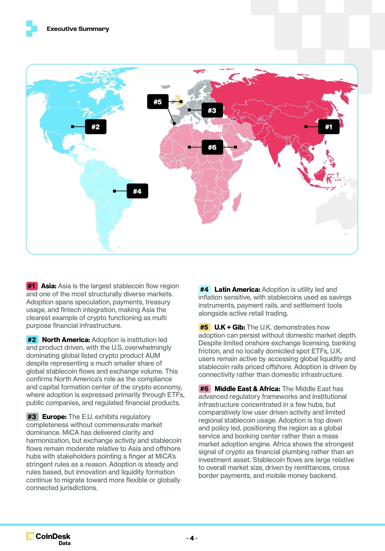 Asia leads in stablecoin flows, trading volume, and on-chain activity, while the U.S. builds the institutional infrastructure set to define crypto's next phase of scaled adoption.