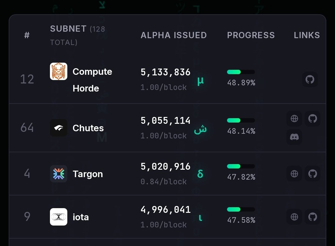 Right now, 128 independent alpha tokens are moving toward their first halving at their issuance.