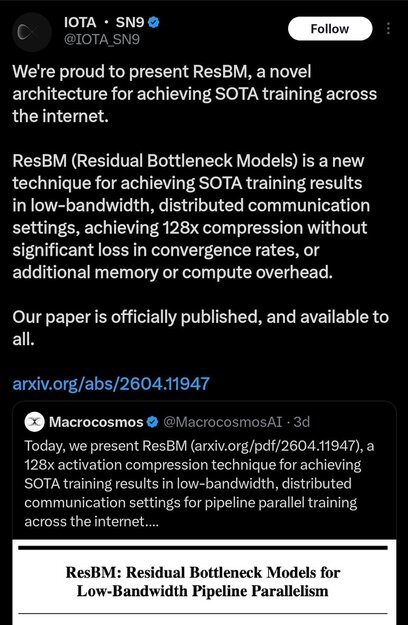 The biggest barrier to truly decentralized frontier model training is not only GPU access. It is bandwidth and communication cost when massive models are split across many machines. Centralized labs solve this using expensive proprietary interconnects inside hyperscale data centers. ResBM attempts to attack that problem directly. What many miss is that this tech moat positions Subnet 9 (@IOTA_SN9), and Bittensor’s pre-training layer more broadly, as a viable alternative for the next wave of open-source models. As training demands continue to rise, the ability to scale efficiently without centralization could become a compounding strategic advantage.