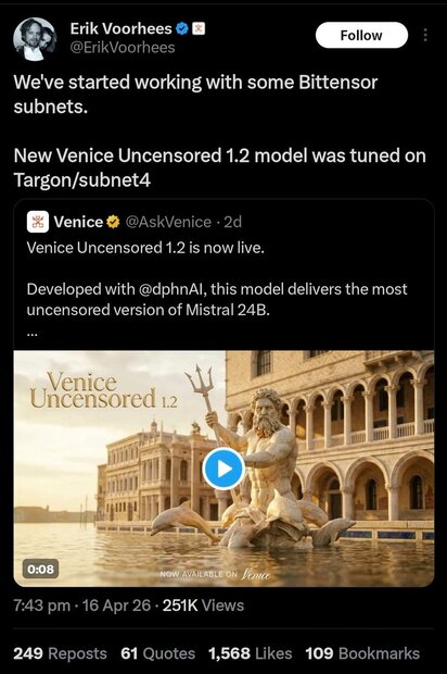 3. Venice Uncensored 1.2 Launches, Trained on Targon (Subnet 4)